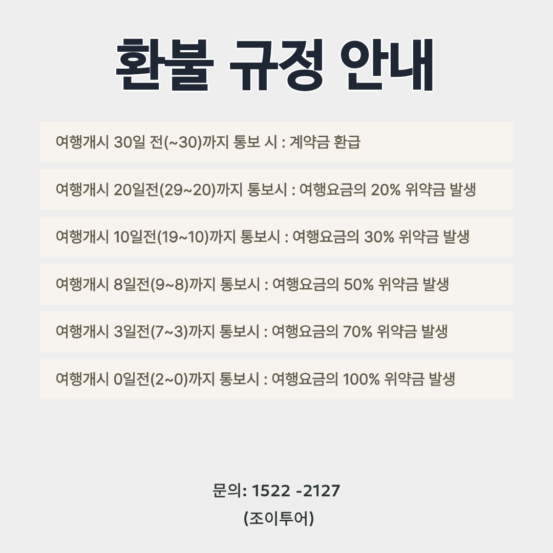 제2조. 취소 위약금 규정(선입금 및 계약금 별도) - 출발일기준 30일전 취소시 상품판매가의 10% 취소위약금 배상 - 출발일기준 29 ~ 21일전 취소시 상품판매가의 20% 취소위약금 배상 - 출발일기준 20 ~ 15일전 취소시 상품판매가의 30% 취소위약금 배상 - 출발일기준 13 ~ 2일전 취소시 상품판매가의 50% 취소위약금 배상 - 출발일기준 1 ~ 당일 취소시 상품판매가의 100% 취소 위약금 |