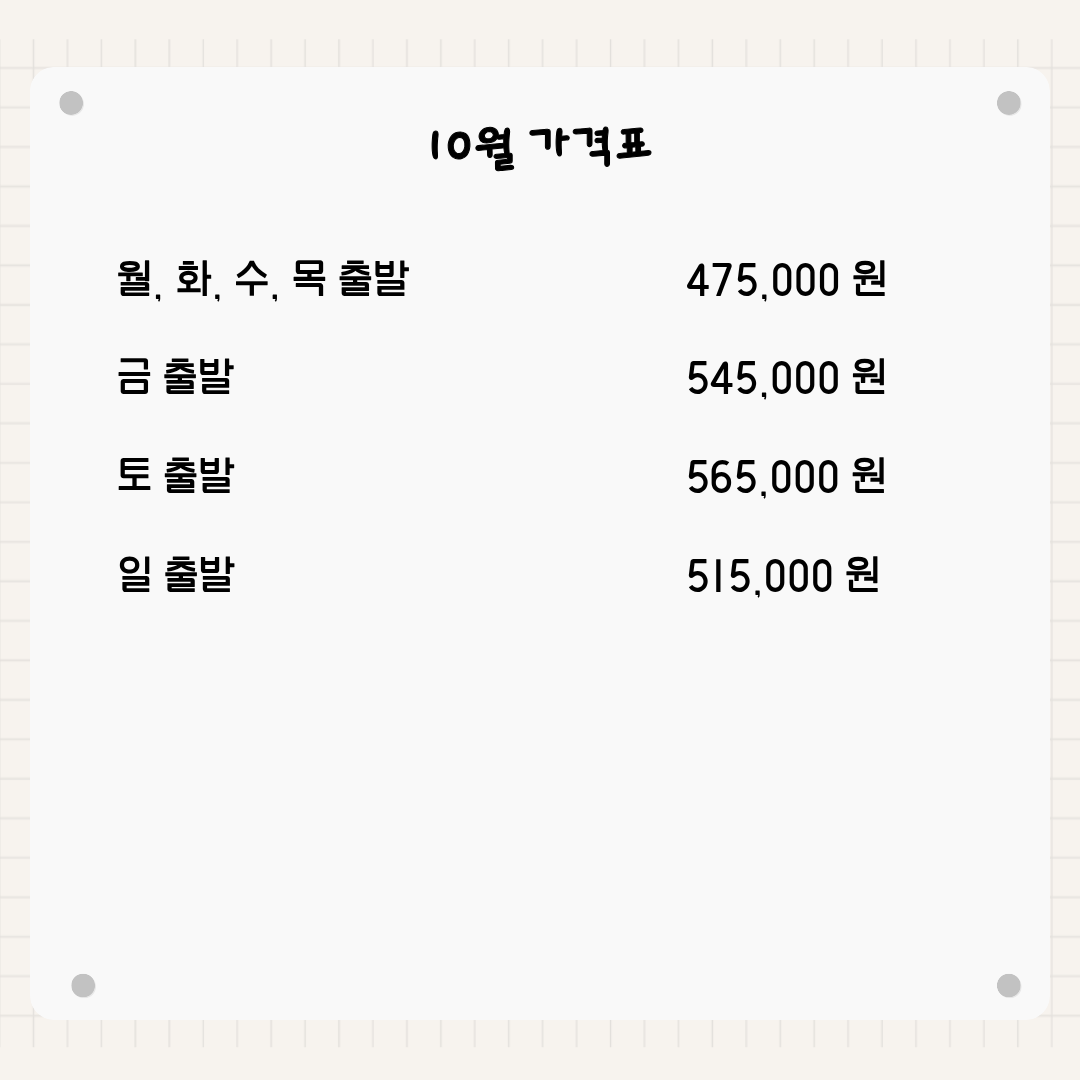 기타사항 - 여권이 있으신 분은 여권에 기재된 정확한 영문이름을 알려주세요. - 여권 기간만료일을 확인하시어, 출발일로부터 최소 6개월 이상 남아 있어야 합니다. - 예약 후 3일 이내에 1인 총금액의 10 ~ 20%를 계약금을 입금하셔야 예약이 확정됩니다. - 예약금은 상품별로 상이 하므로 자세한 사항은 문의 바랍니다. - 주류담배 면세허용범위는 담배 1보루(200개피) 또는 250g 시가, 주류 1리터입니다. |