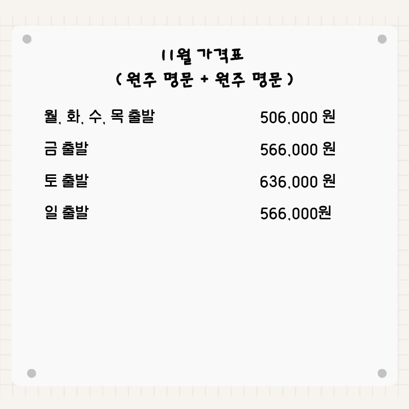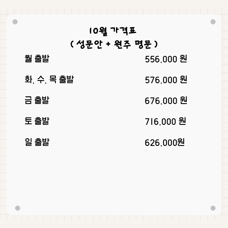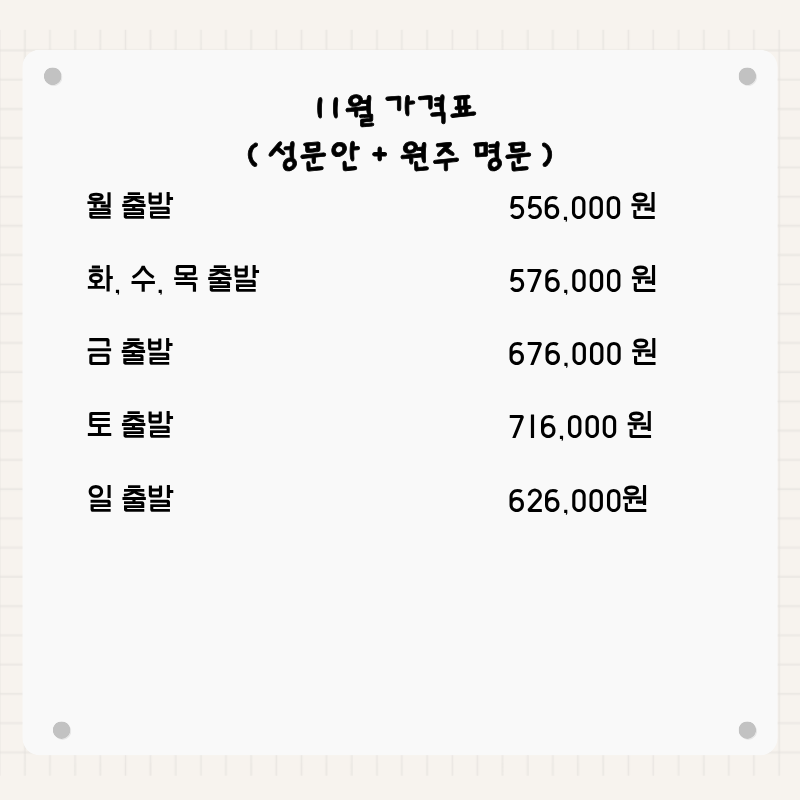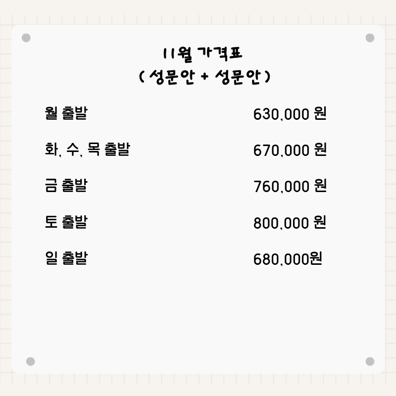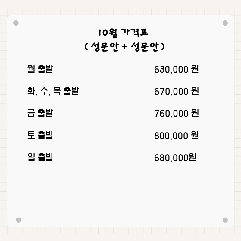기타사항 - 여권이 있으신 분은 여권에 기재된 정확한 영문이름을 알려주세요. - 여권 기간만료일을 확인하시어, 출발일로부터 최소 6개월 이상 남아 있어야 합니다. - 예약 후 3일 이내에 1인 총금액의 10 ~ 20%를 계약금을 입금하셔야 예약이 확정됩니다. - 예약금은 상품별로 상이 하므로 자세한 사항은 문의 바랍니다. - 주류담배 면세허용범위는 담배 1보루(200개피) 또는 250g 시가, 주류 1리터입니다. |