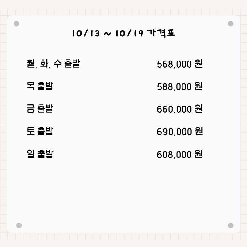기타사항 - 여권이 있으신 분은 여권에 기재된 정확한 영문이름을 알려주세요. - 여권 기간만료일을 확인하시어, 출발일로부터 최소 6개월 이상 남아 있어야 합니다. - 예약 후 3일 이내에 1인 총금액의 10 ~ 20%를 계약금을 입금하셔야 예약이 확정됩니다. - 예약금은 상품별로 상이 하므로 자세한 사항은 문의 바랍니다. - 주류담배 면세허용범위는 담배 1보루(200개피) 또는 250g 시가, 주류 1리터입니다. |