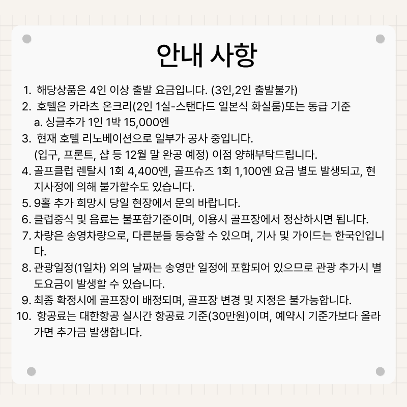 기타사항 - 여권이 있으신 분은 여권에 기재된 정확한 영문이름을 알려주세요. - 여권 기간만료일을 확인하시어, 출발일로부터 최소 6개월 이상 남아 있어야 합니다. - 예약 후 3일 이내에 1인 총금액의 10 ~ 20%를 계약금을 입금하셔야 예약이 확정됩니다. - 예약금은 상품별로 상이 하므로 자세한 사항은 문의 바랍니다. - 주류담배 면세허용범위는 담배 1보루(200개피) 또는 250g 시가, 주류 1리터입니다. |