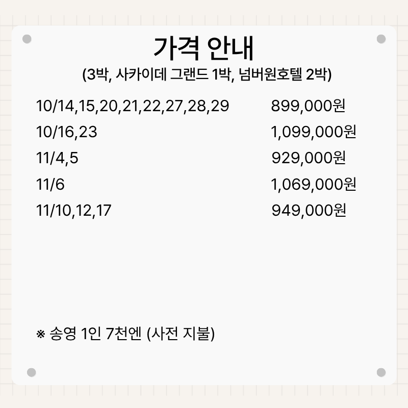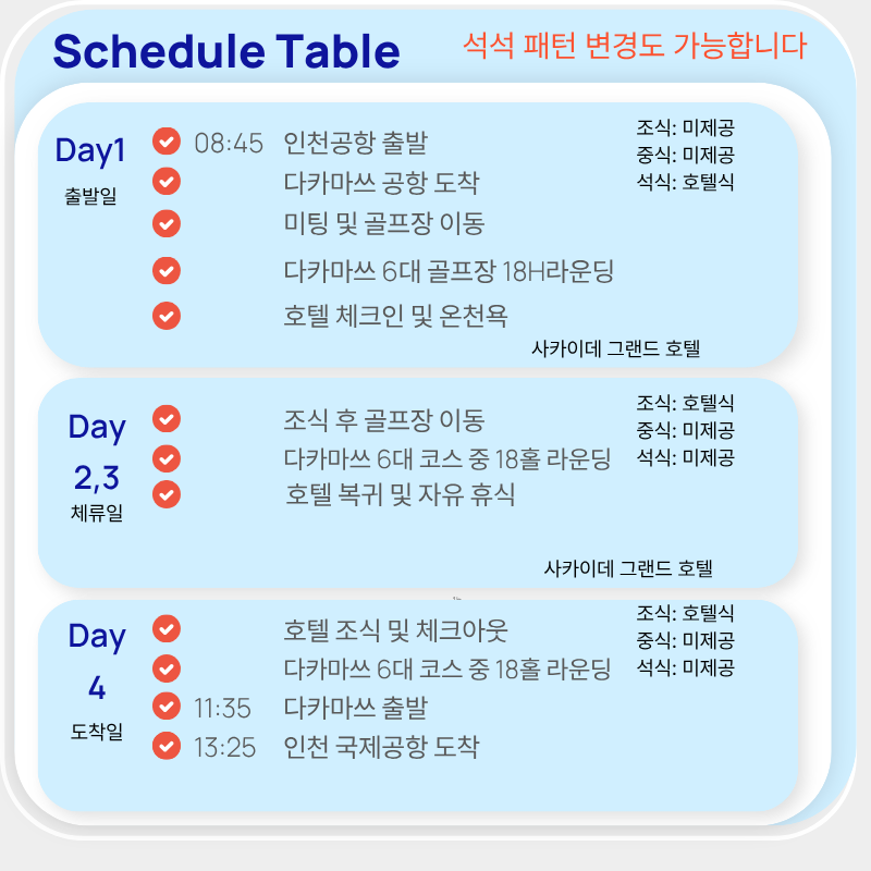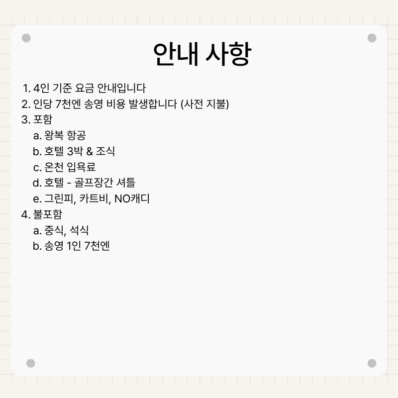 기타사항 - 여권이 있으신 분은 여권에 기재된 정확한 영문이름을 알려주세요. - 여권 기간만료일을 확인하시어, 출발일로부터 최소 6개월 이상 남아 있어야 합니다. - 예약 후 3일 이내에 1인 총금액의 10 ~ 20%를 계약금을 입금하셔야 예약이 확정됩니다. - 예약금은 상품별로 상이 하므로 자세한 사항은 문의 바랍니다. - 주류담배 면세허용범위는 담배 1보루(200개피) 또는 250g 시가, 주류 1리터입니다. |