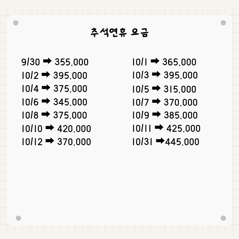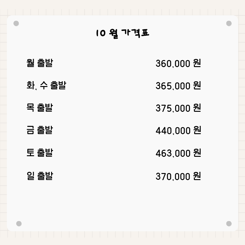 기타사항 - 여권이 있으신 분은 여권에 기재된 정확한 영문이름을 알려주세요. - 여권 기간만료일을 확인하시어, 출발일로부터 최소 6개월 이상 남아 있어야 합니다. - 예약 후 3일 이내에 1인 총금액의 10 ~ 20%를 계약금을 입금하셔야 예약이 확정됩니다. - 예약금은 상품별로 상이 하므로 자세한 사항은 문의 바랍니다. - 주류담배 면세허용범위는 담배 1보루(200개피) 또는 250g 시가, 주류 1리터입니다. |