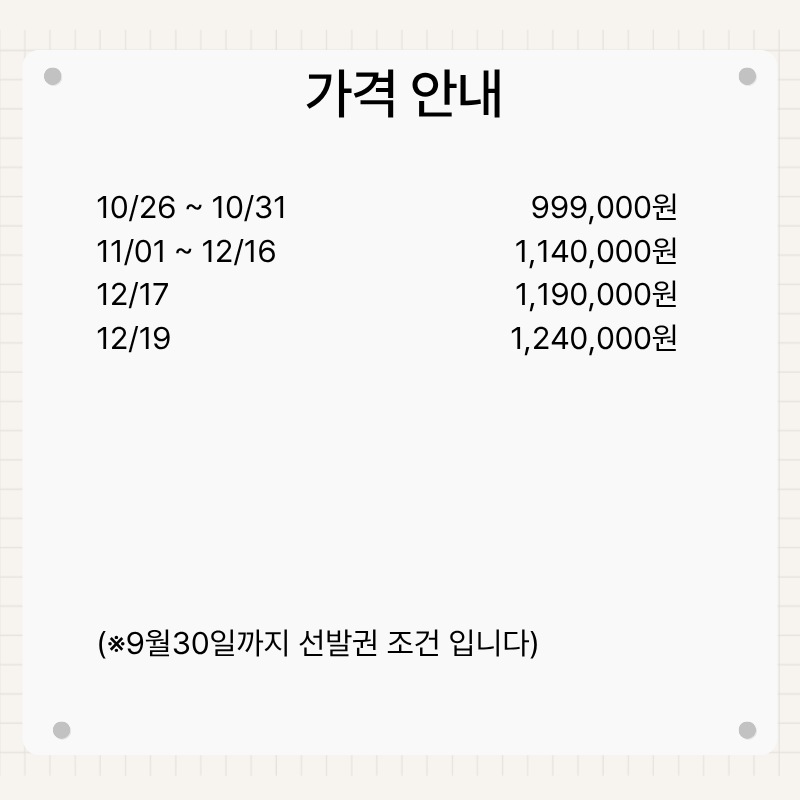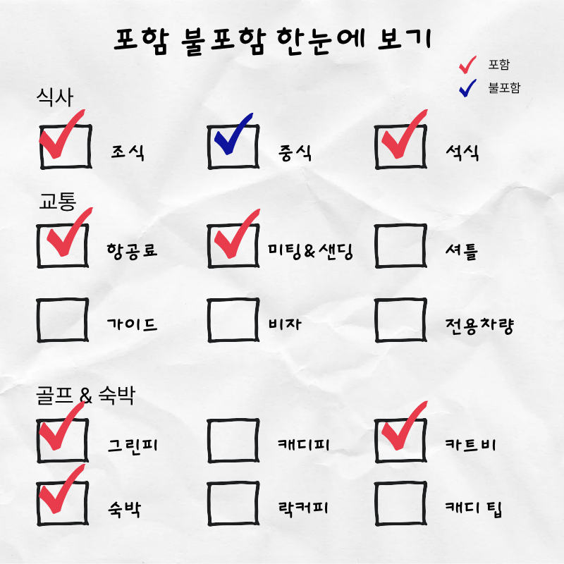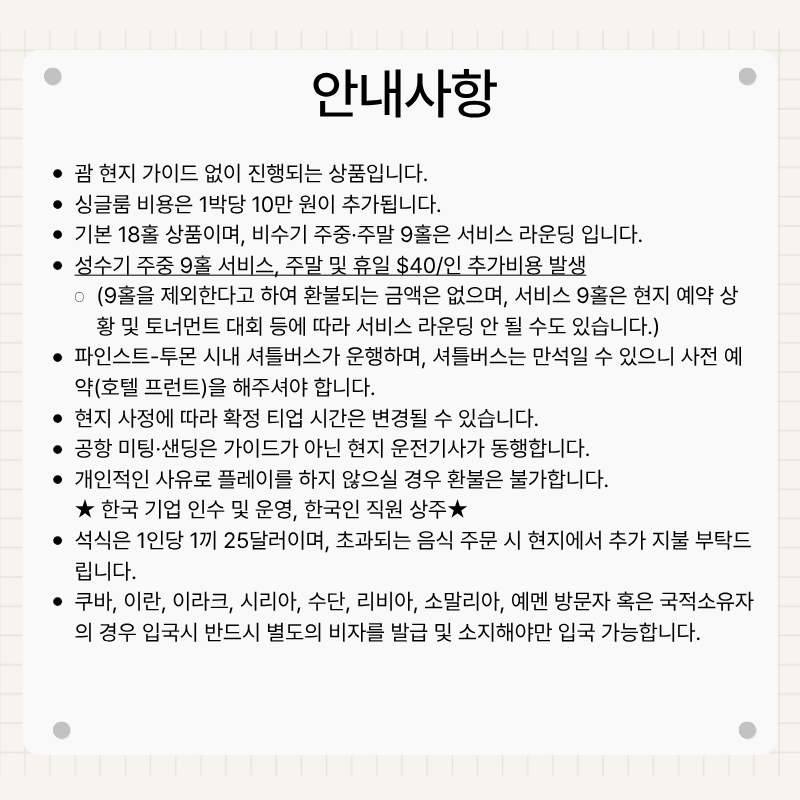 기타사항 - 여권이 있으신 분은 여권에 기재된 정확한 영문이름을 알려주세요. - 여권 기간만료일을 확인하시어, 출발일로부터 최소 6개월 이상 남아 있어야 합니다. - 예약 후 3일 이내에 1인 총금액의 10 ~ 20%를 계약금을 입금하셔야 예약이 확정됩니다. - 예약금은 상품별로 상이 하므로 자세한 사항은 문의 바랍니다. - 주류담배 면세허용범위는 담배 1보루(200개피) 또는 250g 시가, 주류 1리터입니다. |