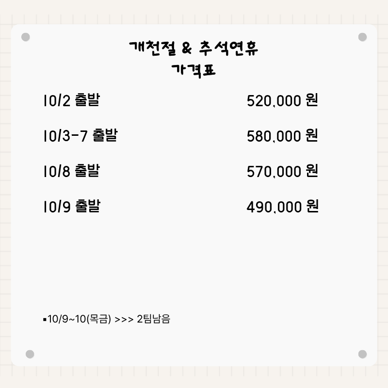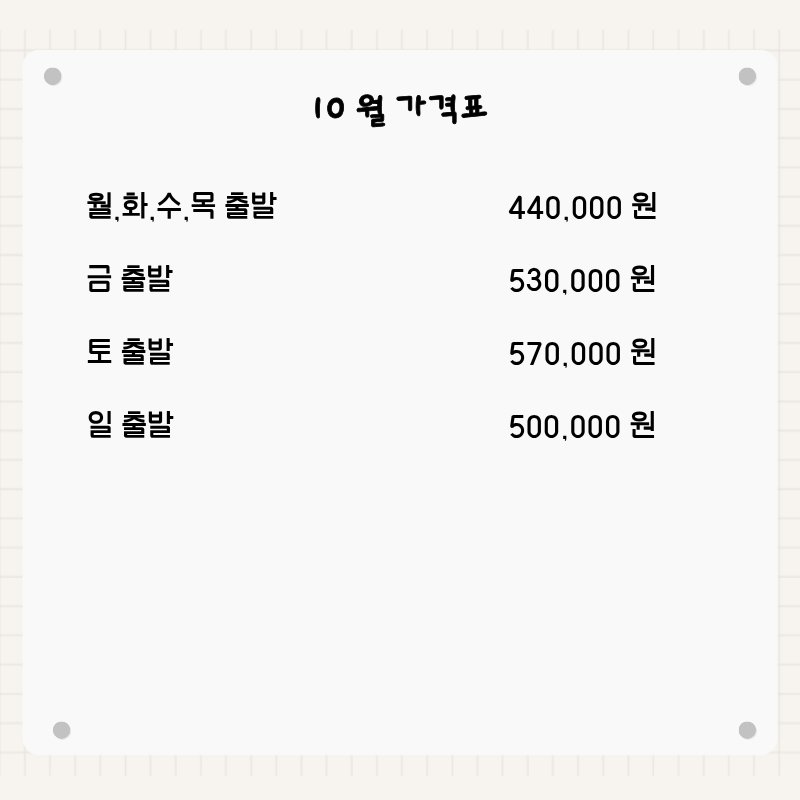 기타사항 - 여권이 있으신 분은 여권에 기재된 정확한 영문이름을 알려주세요. - 여권 기간만료일을 확인하시어, 출발일로부터 최소 6개월 이상 남아 있어야 합니다. - 예약 후 3일 이내에 1인 총금액의 10 ~ 20%를 계약금을 입금하셔야 예약이 확정됩니다. - 예약금은 상품별로 상이 하므로 자세한 사항은 문의 바랍니다. - 주류담배 면세허용범위는 담배 1보루(200개피) 또는 250g 시가, 주류 1리터입니다. |