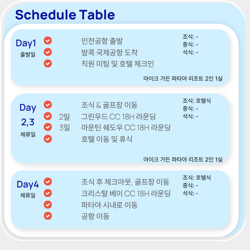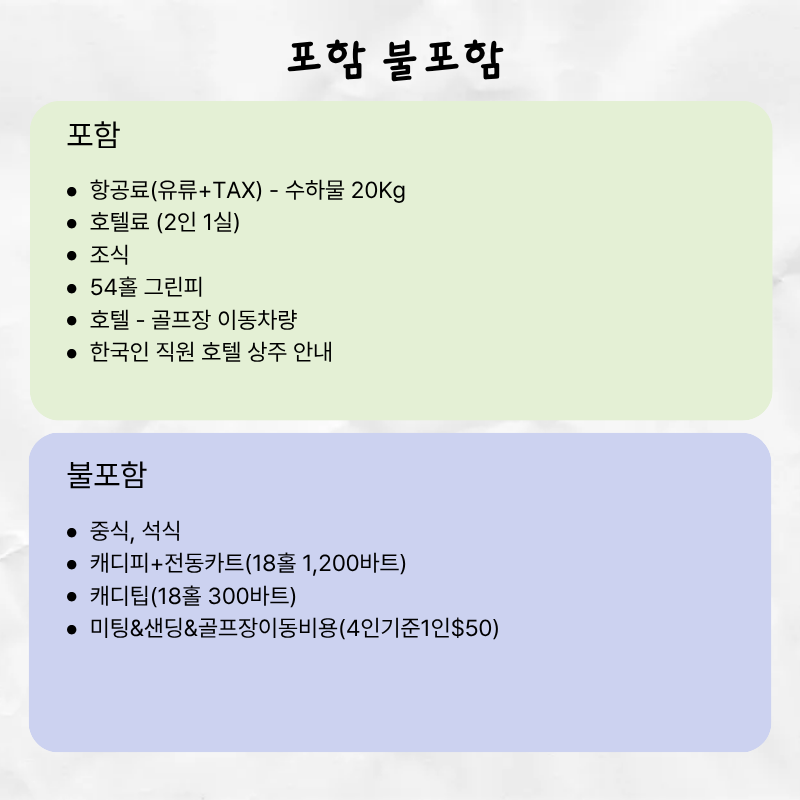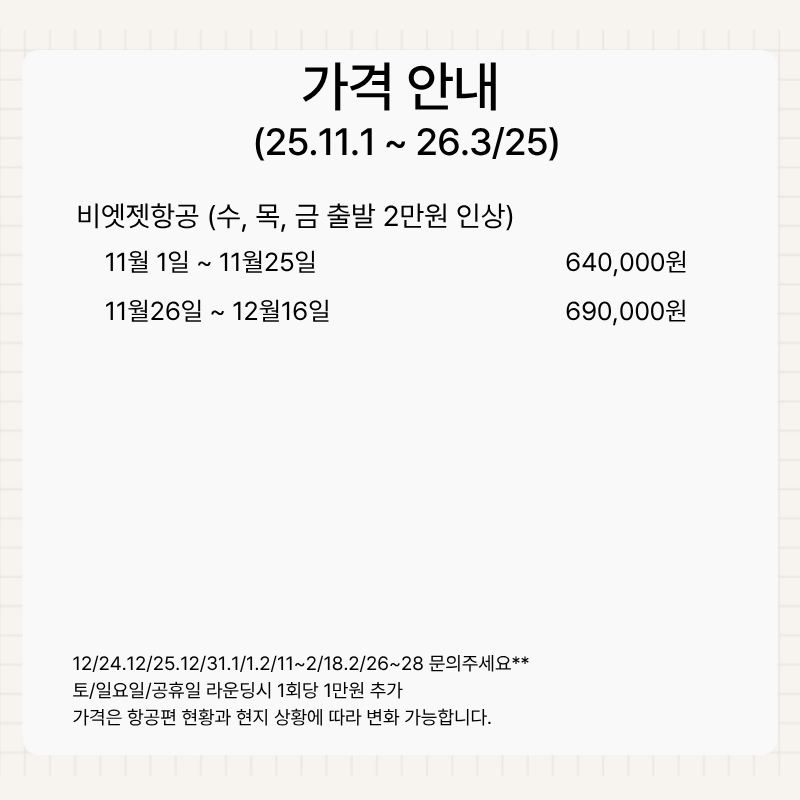 기타사항 - 여권이 있으신 분은 여권에 기재된 정확한 영문이름을 알려주세요. - 여권 기간만료일을 확인하시어, 출발일로부터 최소 6개월 이상 남아 있어야 합니다. - 예약 후 3일 이내에 1인 총금액의 10 ~ 20%를 계약금을 입금하셔야 예약이 확정됩니다. - 예약금은 상품별로 상이 하므로 자세한 사항은 문의 바랍니다. - 주류담배 면세허용범위는 담배 1보루(200개피) 또는 250g 시가, 주류 1리터입니다. |