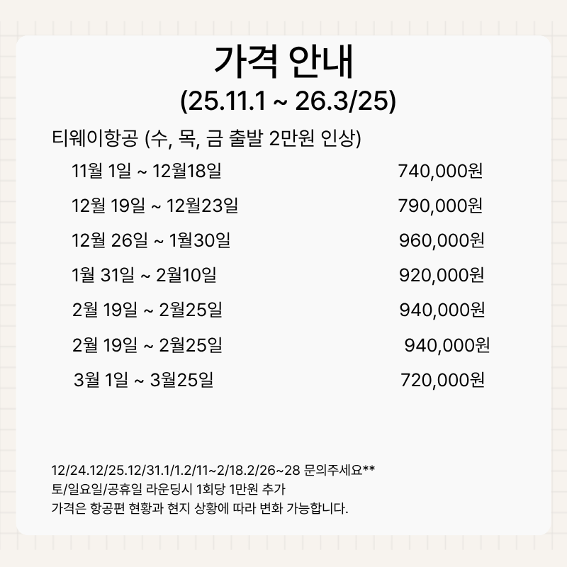 유류 할증료 - 국제유가와 항공사의 영업환경을 고려한 건설교통부의 국제선 항공요금과 유류할증료 확대방안’에 따라 예고 없이 인상되거나, 인하된 금액이 반영될 수 있습니다. |