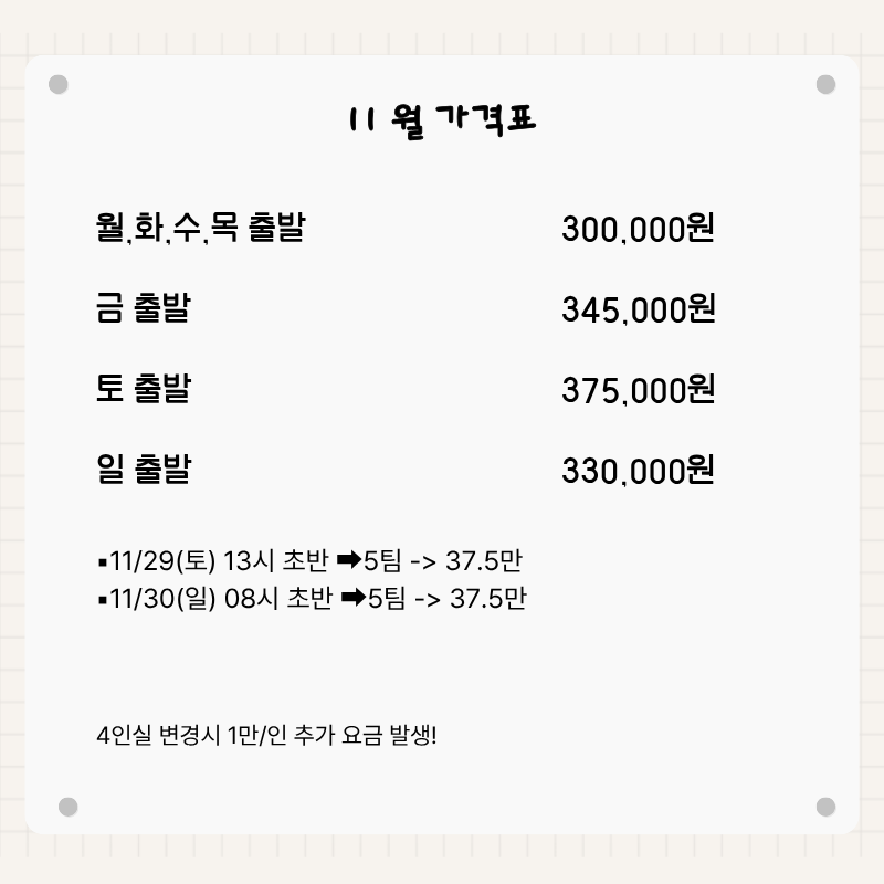 기타사항 - 여권이 있으신 분은 여권에 기재된 정확한 영문이름을 알려주세요. - 여권 기간만료일을 확인하시어, 출발일로부터 최소 6개월 이상 남아 있어야 합니다. - 예약 후 3일 이내에 1인 총금액의 10 ~ 20%를 계약금을 입금하셔야 예약이 확정됩니다. - 예약금은 상품별로 상이 하므로 자세한 사항은 문의 바랍니다. - 주류담배 면세허용범위는 담배 1보루(200개피) 또는 250g 시가, 주류 1리터입니다. |