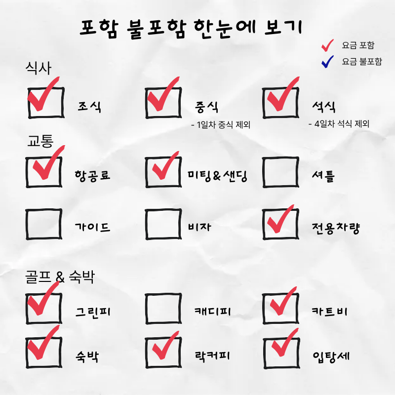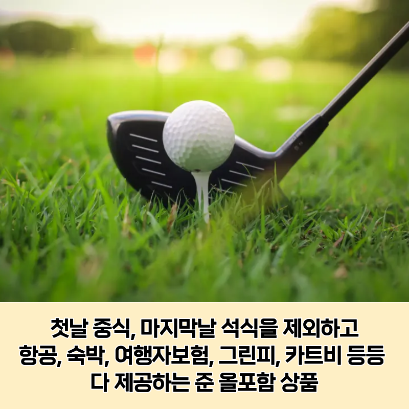 왕복 항공권(KE), 72홀 그린피/카트/락커, 전 일정 식사(조/중/석), 왕복 송영 차량, 여행자보험 포함.