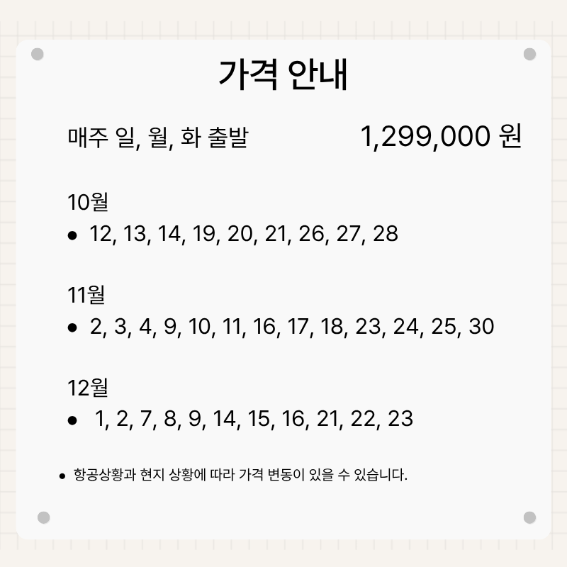 2025년 10월 12일 ~ 12월 23일 중 일, 월, 화 출발 한정.