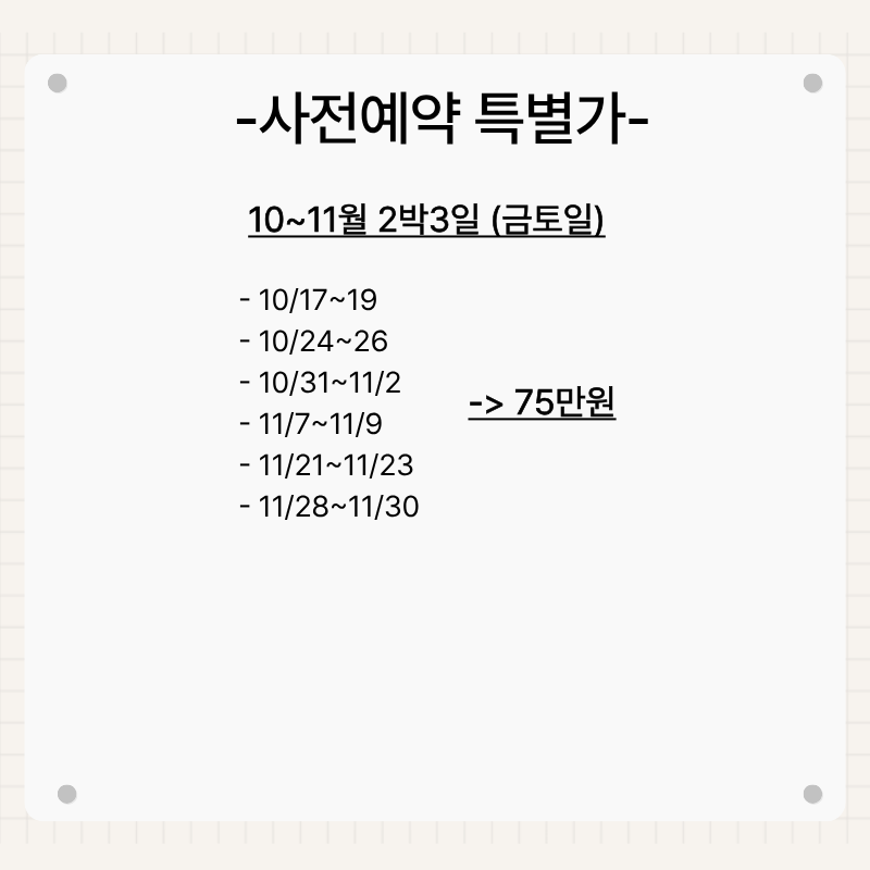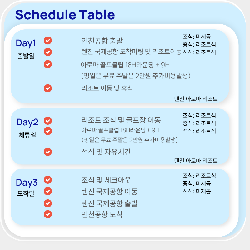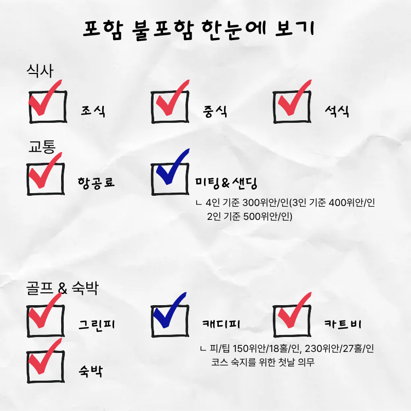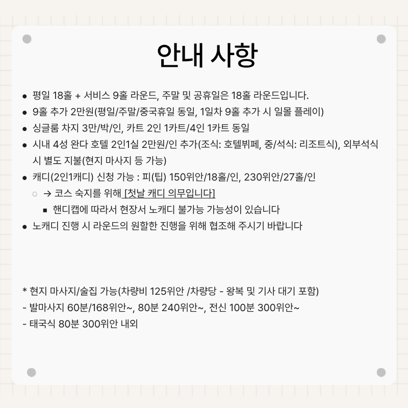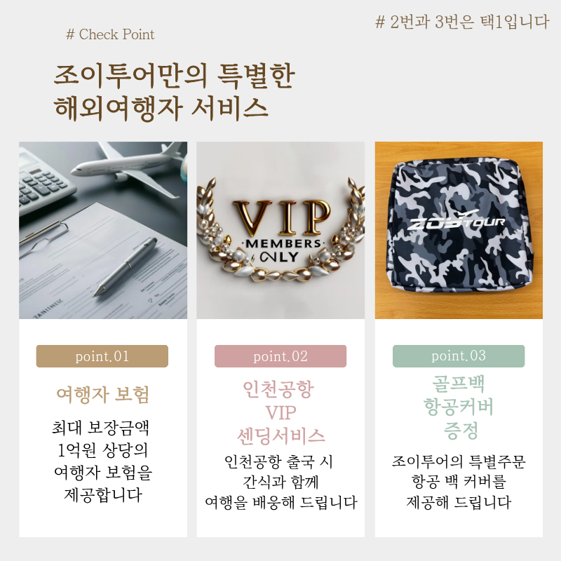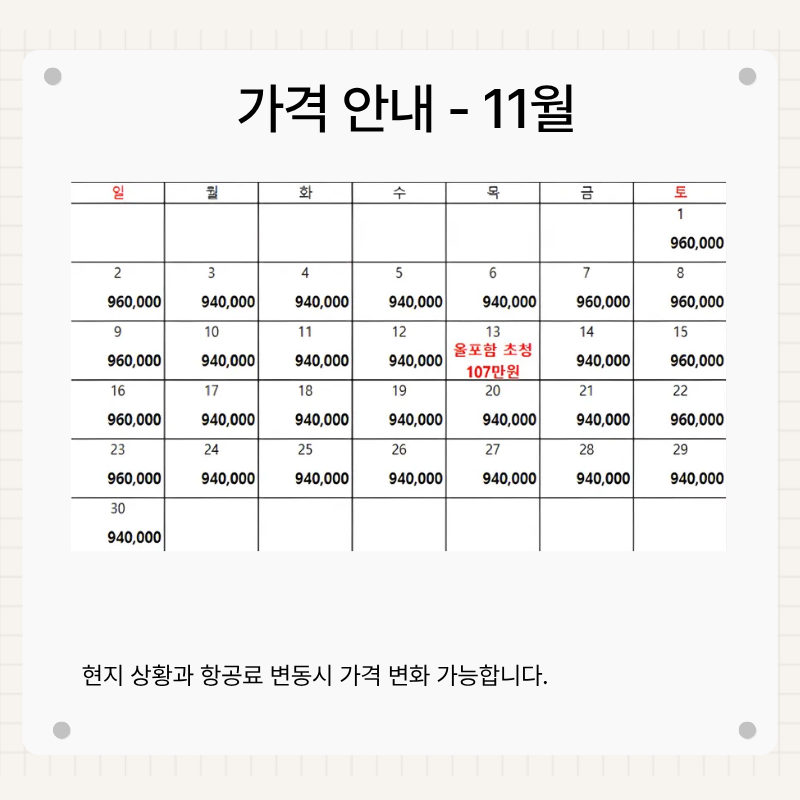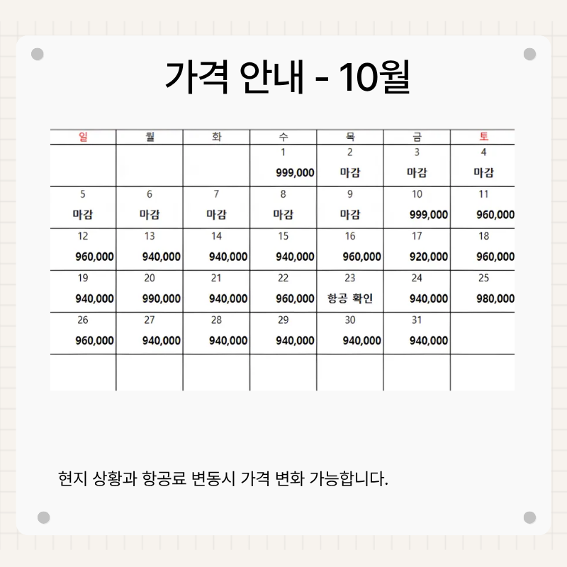 기타사항 - 여권이 있으신 분은 여권에 기재된 정확한 영문이름을 알려주세요. - 여권 기간만료일을 확인하시어, 출발일로부터 최소 6개월 이상 남아 있어야 합니다. - 예약 후 3일 이내에 1인 총금액의 10 ~ 20%를 계약금을 입금하셔야 예약이 확정됩니다. - 예약금은 상품별로 상이 하므로 자세한 사항은 문의 바랍니다. - 주류담배 면세허용범위는 담배 1보루(200개피) 또는 250g 시가, 주류 1리터입니다. |