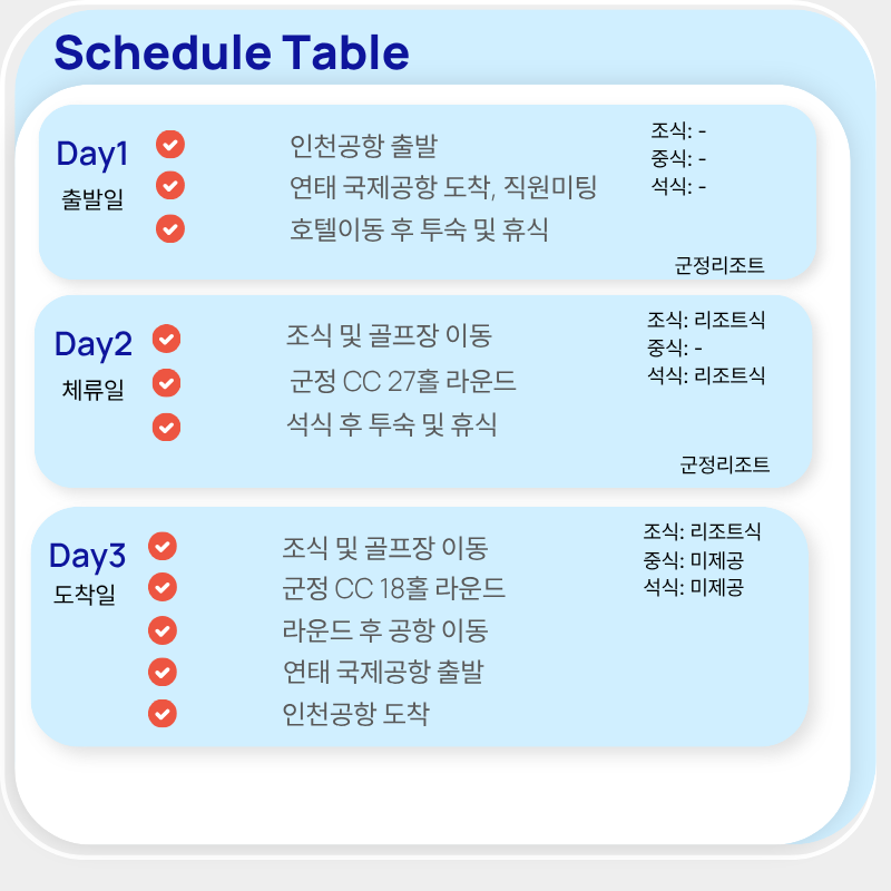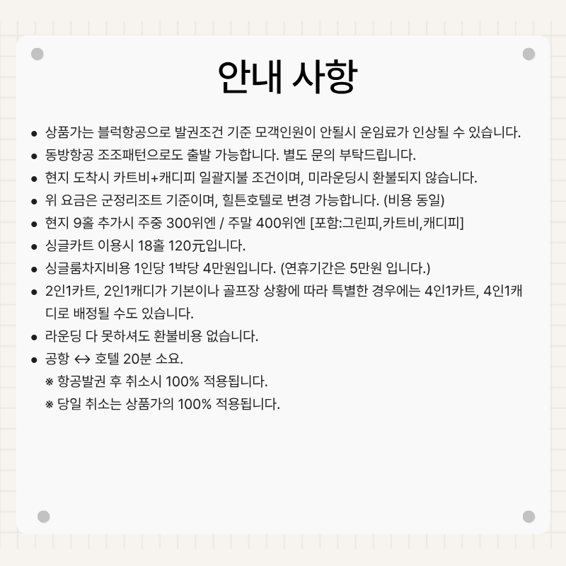 기타사항 - 여권이 있으신 분은 여권에 기재된 정확한 영문이름을 알려주세요. - 여권 기간만료일을 확인하시어, 출발일로부터 최소 6개월 이상 남아 있어야 합니다. - 예약 후 3일 이내에 1인 총금액의 10 ~ 20%를 계약금을 입금하셔야 예약이 확정됩니다. - 예약금은 상품별로 상이 하므로 자세한 사항은 문의 바랍니다. - 주류담배 면세허용범위는 담배 1보루(200개피) 또는 250g 시가, 주류 1리터입니다. |