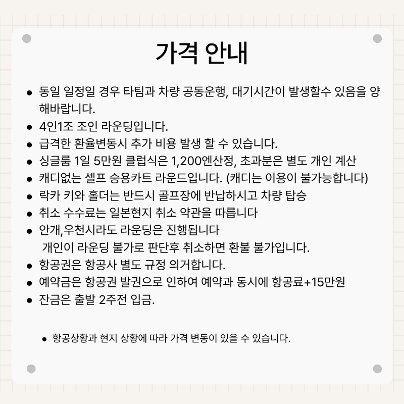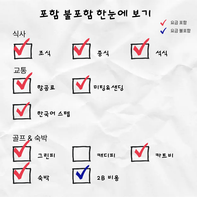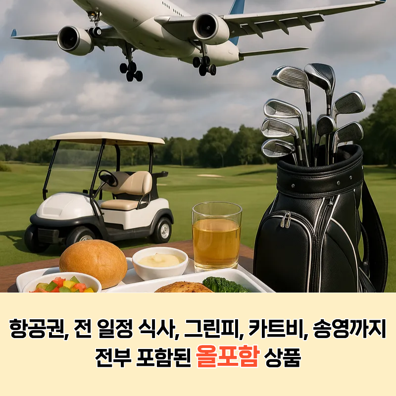왕복 항공료, 호텔(2인1실), 전 일정 그린피/카트비, 식사(조/중/석) 모두 포함.