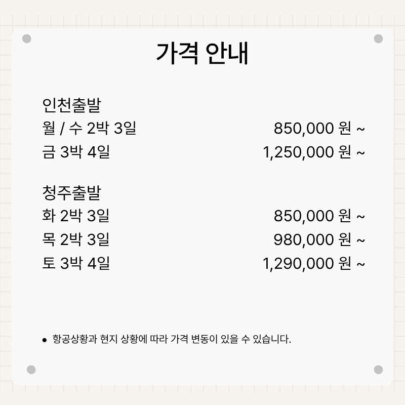 항공권 포함 초특가 850,000원부터. 청주 또는 11월 12일 취항하는 인천 출발 가능 (월/수/금 주 3회 운항).