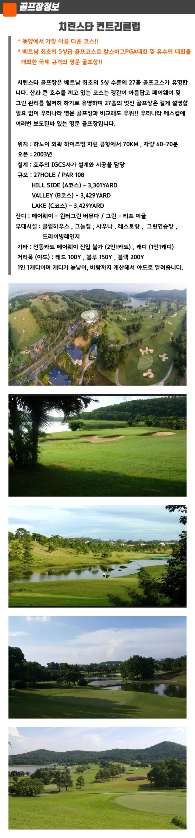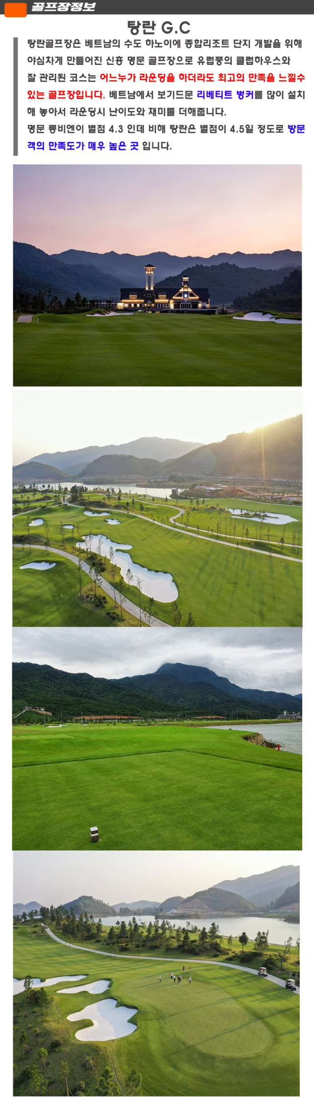 - 특장점역사 및 규모: 2003년 개장한 베트남 최초의 5성급 골프장으로, 2004년 PGA 투어 대회인 '칼스버그 마스터스 베트남 오픈'이 개최되기도 한 국제 규모의 코스입니다.