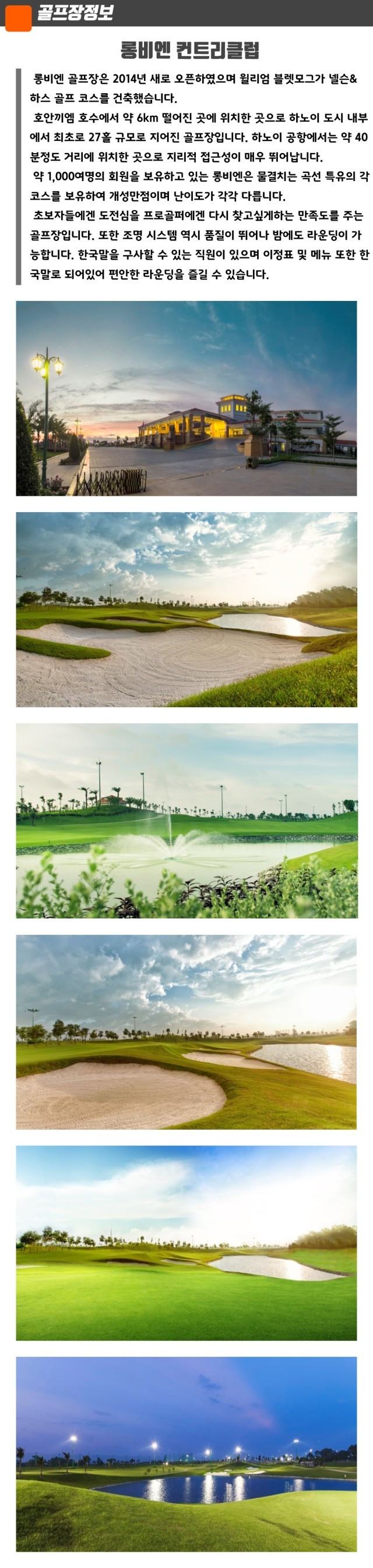 - 특장점접근성: 하노이 시내에서 가장 가까운 골프장으로, 시내 중심부에서 약 10km, 차량으로 20~30분 거리에 위치하여 접근성이 매우 뛰어납니다.