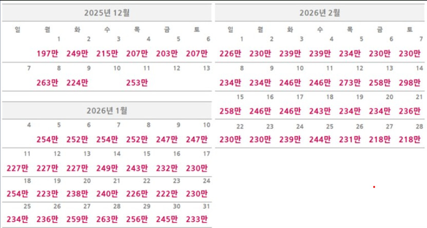 출발 기간: 2025년 12월 ~ 2026년 2월 (동계 성수기)