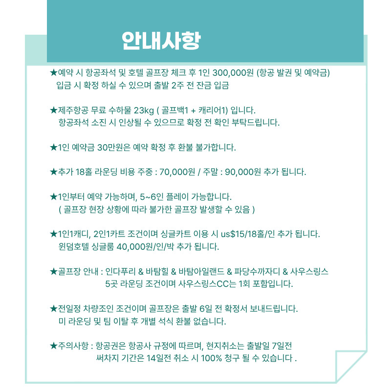 기타사항 - 여권이 있으신 분은 여권에 기재된 정확한 영문이름을 알려주세요. - 여권 기간만료일을 확인하시어, 출발일로부터 최소 6개월 이상 남아 있어야 합니다. - 예약 후 3일 이내에 1인 총금액의 10 ~ 20%를 계약금을 입금하셔야 예약이 확정됩니다. - 예약금은 상품별로 상이 하므로 자세한 사항은 문의 바랍니다. - 주류담배 면세허용범위는 담배 1보루(200개피) 또는 250g 시가, 주류 1리터입니다. |
