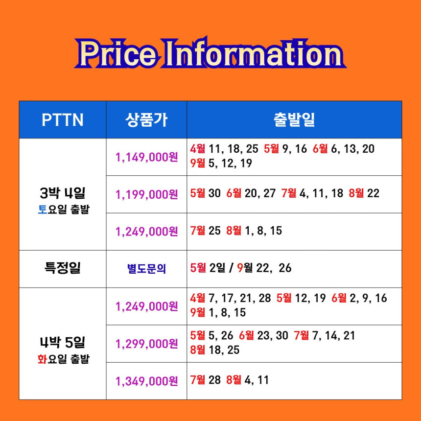 기타사항 - 여권이 있으신 분은 여권에 기재된 정확한 영문이름을 알려주세요. - 여권 기간만료일을 확인하시어, 출발일로부터 최소 6개월 이상 남아 있어야 합니다. - 예약 후 3일 이내에 1인 총금액의 10 ~ 20%를 계약금을 입금하셔야 예약이 확정됩니다. - 예약금은 상품별로 상이 하므로 자세한 사항은 문의 바랍니다. - 주류담배 면세허용범위는 담배 1보루(200개피) 또는 250g 시가, 주류 1리터입니다. |